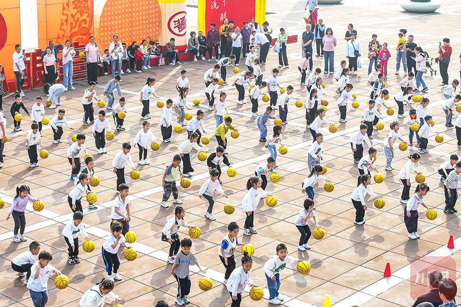 2024年4月16日,合江县旺旺幼儿园的孩子们在展示幼儿篮球操等基本技能,乐享户外运动乐趣。