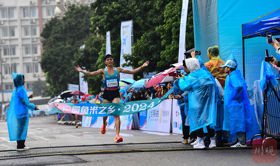 合江县第一届半程马拉松比赛中,青年组第一名到达终点。