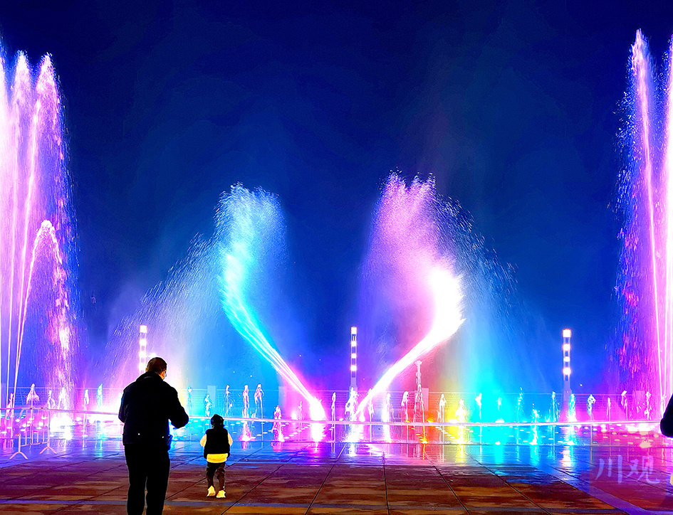 灯光秀丽的合江滨江音乐喷泉,吸引老人孩子观看。