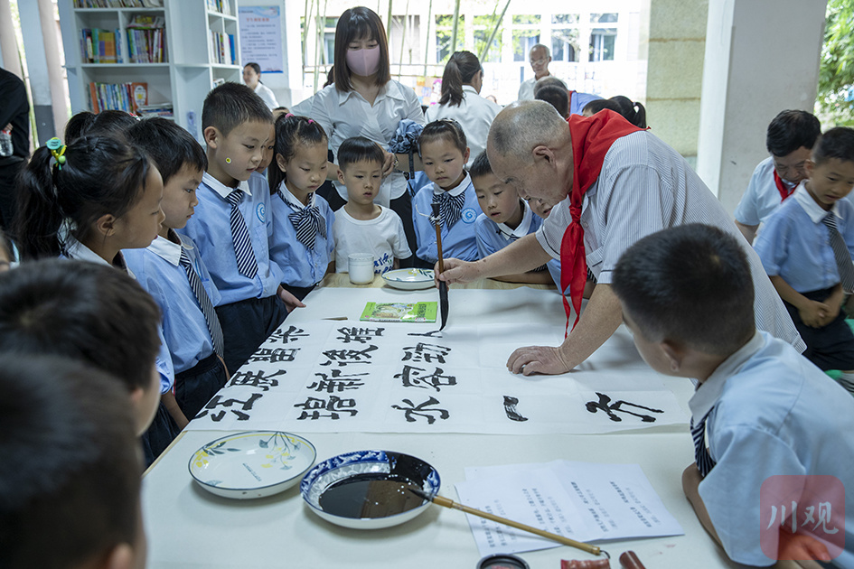 合江县老年诗书画研究会老艺术家走进人民小学,向学生们现场展示讲授中国传统书画艺术。