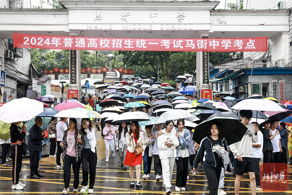 2024年6月7日中午,高考第一场考试结束,考生们从合江县马街中学考点冒雨从容步出考场。