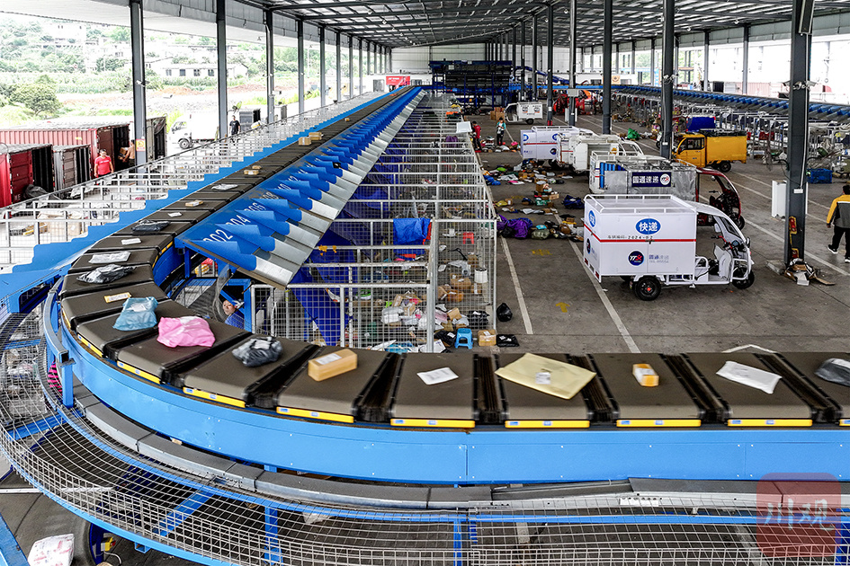 2024年2月6日,合江县快递物流产业仓配中心自动化分拣线上,工作人员在认真分拣、打包、转运快递包裹。