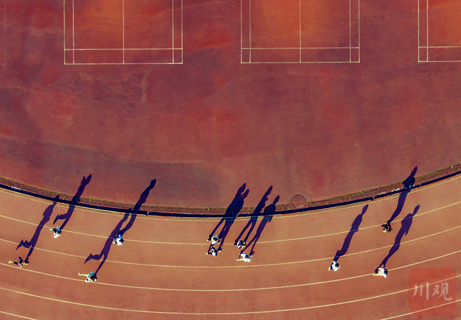 合江县三河职业学院运动场上锻炼的学子,阳光下形与影组合成有趣的画面。