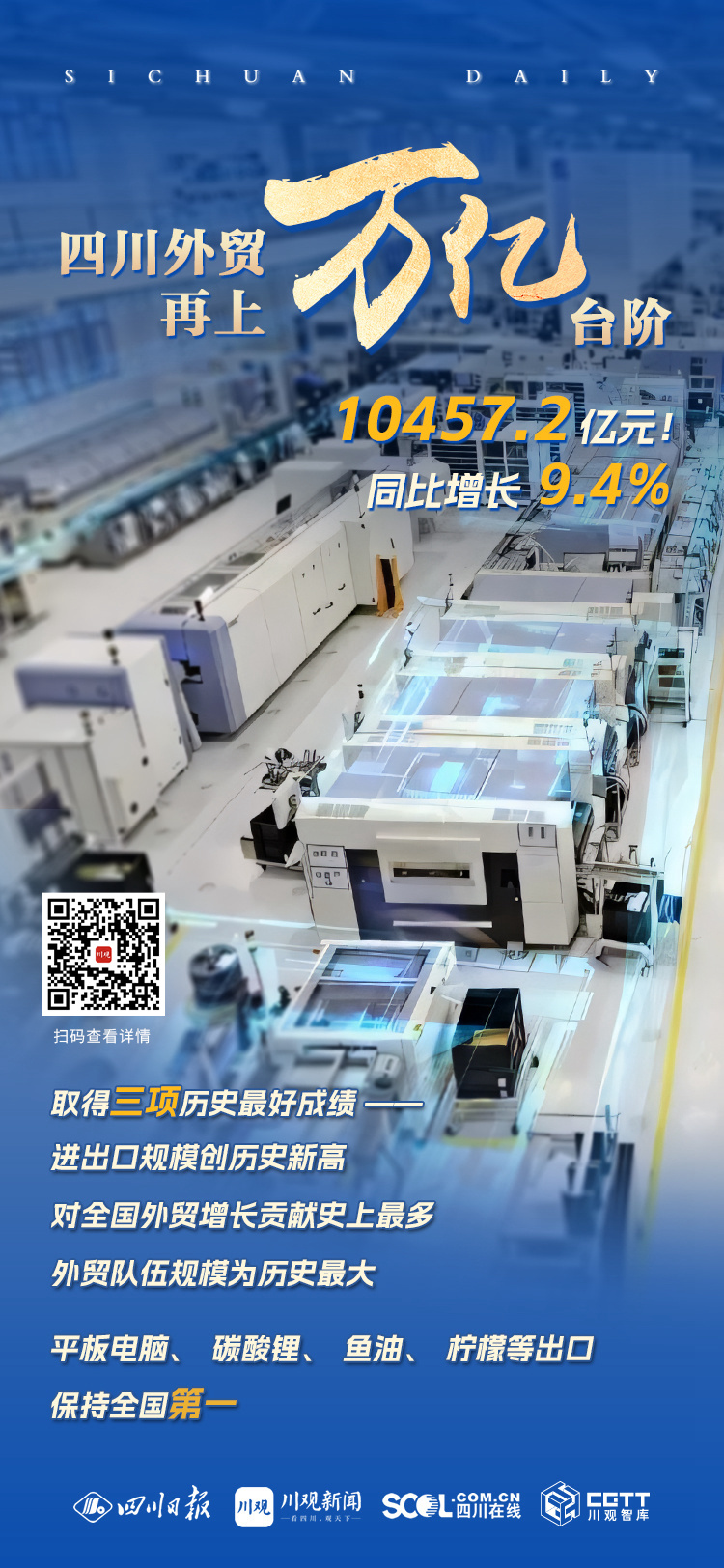 四川外贸再上万亿台阶!1月19日,成都海关发布数据显示,2024年四川实现外贸进出口10457.2亿元,同比增长9.4%,高出全国4.4个百分点,实现进出口规模创历史新高、对全国外贸增长贡献史上最多、外贸主体队伍规模历史最大等三项历史最好成绩。