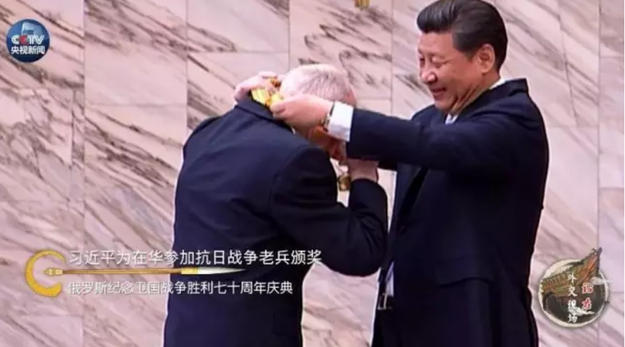 2015年5月,在俄罗斯纪念卫国战争胜利七十周年庆典期间,习近平为曾经在华参加抗日战争的俄罗斯老战士颁奖。一名俄罗斯老兵紧紧握住习近平的手,轻轻吻了一下。习近平也紧紧握住他的手,深情地望着他。