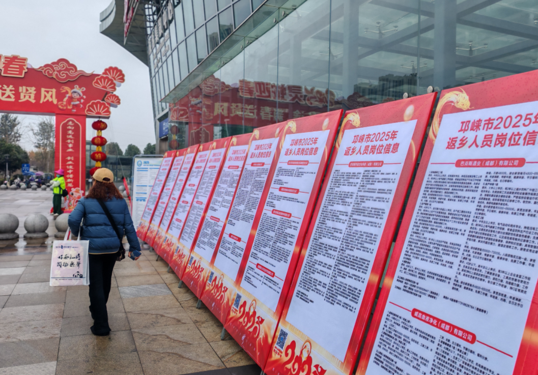 “几年没回家了,感觉家乡发展变化很大,我打算年后就在本地找个合适的工作。”在成都邛崃市高铁站,返乡人员张女士刚出站,就发现摆在出站口的岗位信息展板。在出站口另一端,求职就业服务点的志愿者们设置了邛崃市人力资源和社会保障局官方微信公众号、四川省农民工服务平台等二维码,积极引导返乡人员扫码关注。