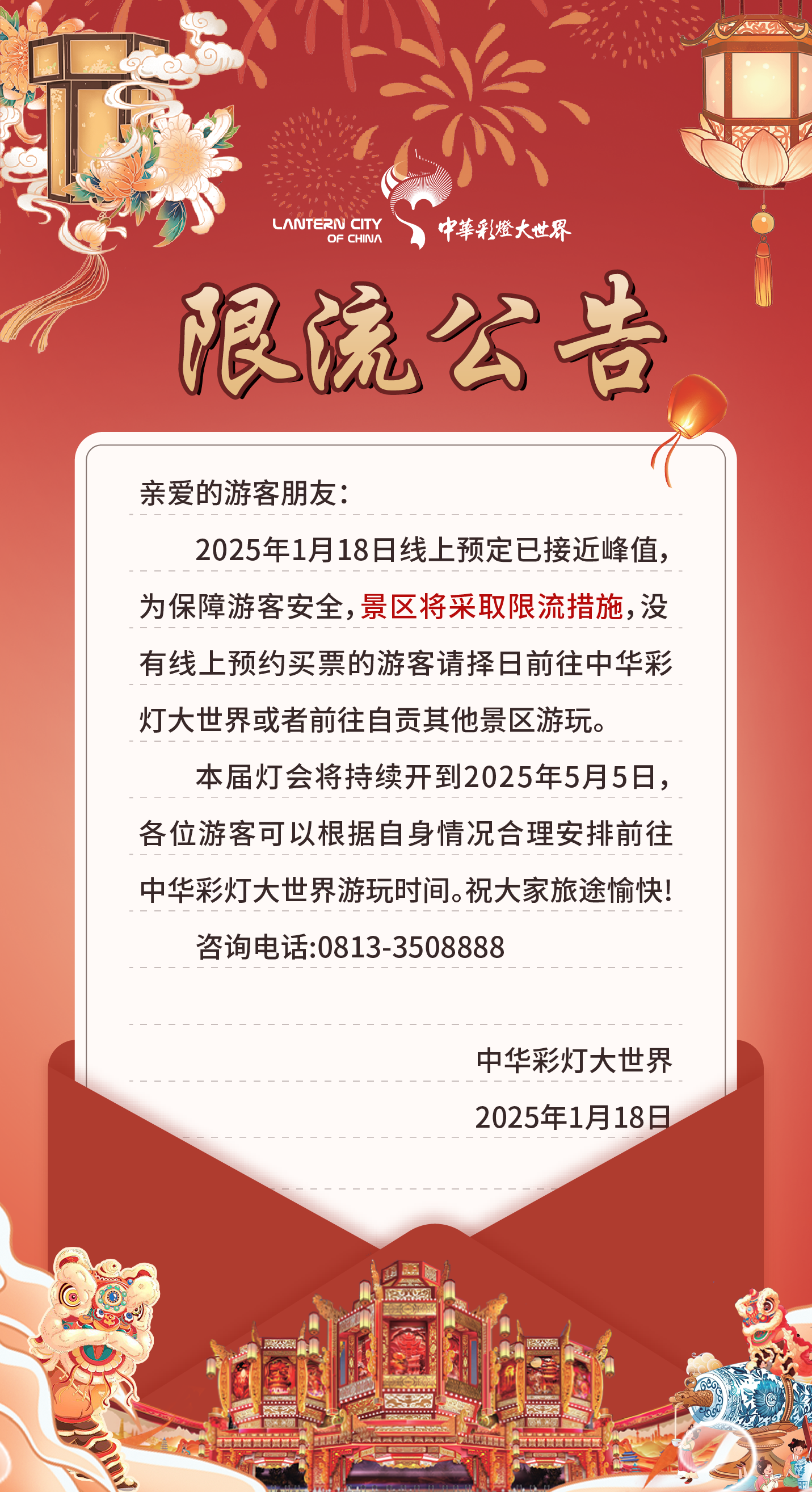 1月18日,记者从自贡文旅发展集团公众号获悉,1月18日自贡灯会线上预定已接近峰值,为保障游客安全,景区将采取限流措施,没有线上预约买票的游客请择日前往灯会现场,或者前往自贡其他景区游玩。公告如下: