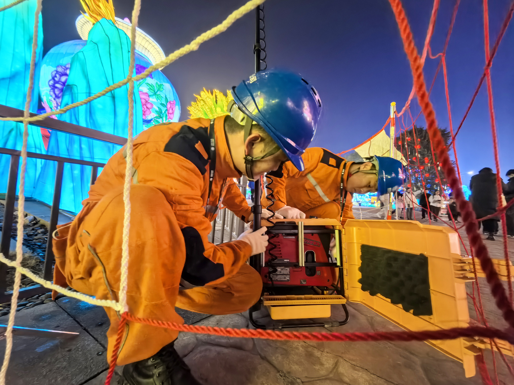 园区外,在灯会供电专线环网柜、开关处驻守的保电人员,手握红外测温仪开始对线路开展测温特巡。园区内,三名保电员工坚守在应急发电车旁,保障灯会主舞台用电“零中断”。20余位保电员工分为10组,在人流聚集地的一号桥、二号桥等区域携应急照明灯现场蹲守;在开闭所、配电室等关键供电设备处,协助园区工作人员监控运维;用电检查人员携红外测温仪,沿着划分的巡视线路对灯组进行全覆盖巡视。