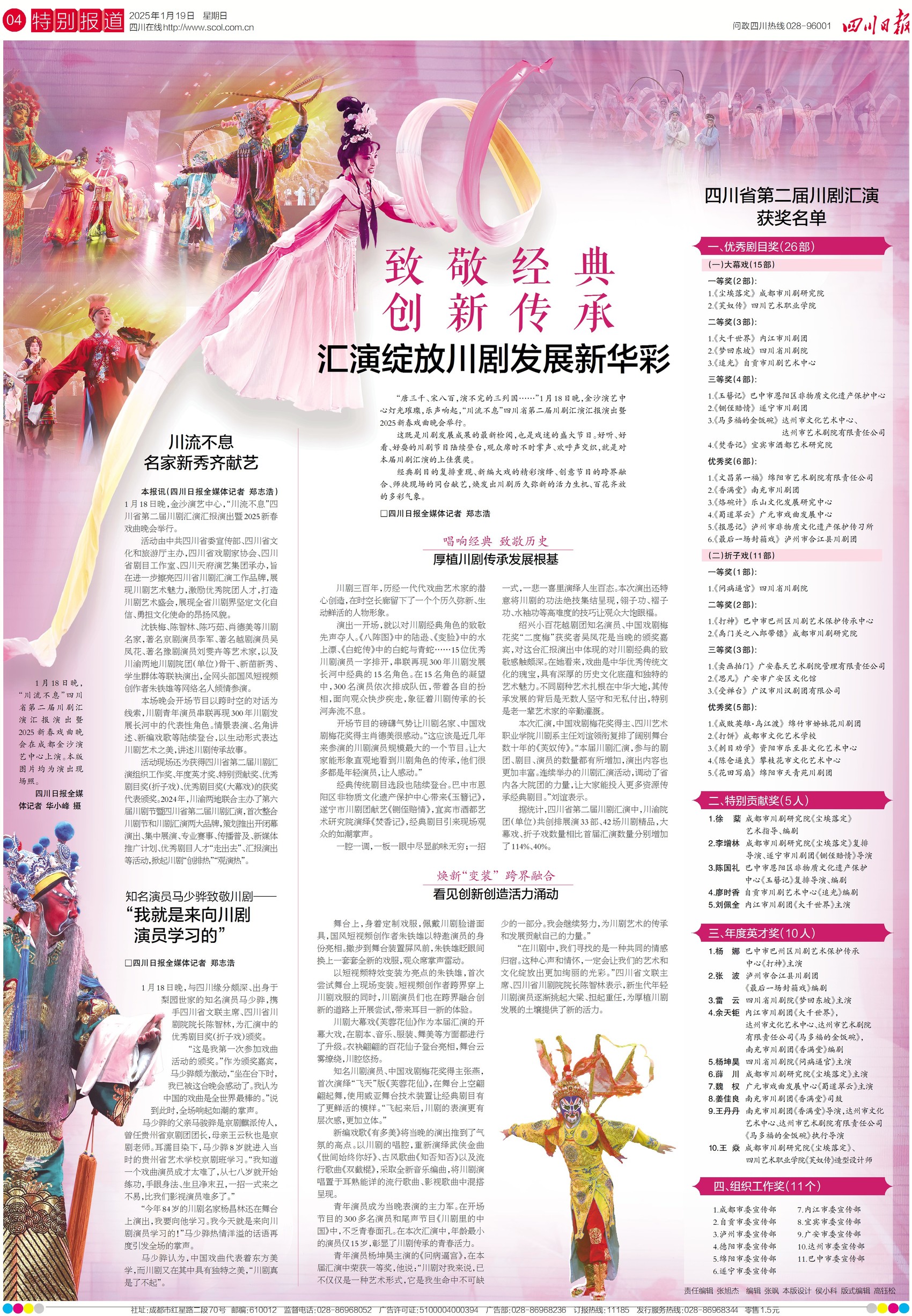 昨天,“川流不息”四川省第二届川剧汇演汇报演出暨2025新春戏曲晚会在成都举行。情景表演、名角讲述、新编戏歌等陆续登台,以生动形式表达川剧艺术之美,讲述川剧传承故事。今日四版,看看现场都有哪些剧目获奖!