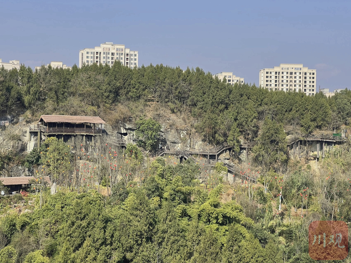 不仅如此,园区设计上还有一处小巧思。穿过飞翔影院楼栋旁的连廊,一条石头路随着恩阳城区的山体地势盘旋修建,一直向前延伸。“这条路是米仓栈道,按照米仓古道1:1复刻形制,融入石刻、碑刻、题记等文化元素。”刘贞佳介绍,参照米仓古道“五里一邮,十里一亭,三十里一驿”的配置模式,沿线设置了幺店子、歇气台、休息亭等设施。“全长1600米,从园区出发,可以一直步行到恩阳古镇南入口,实现联动连通,让游客在散步休闲的同时,感受古老神秘的米仓文化。”