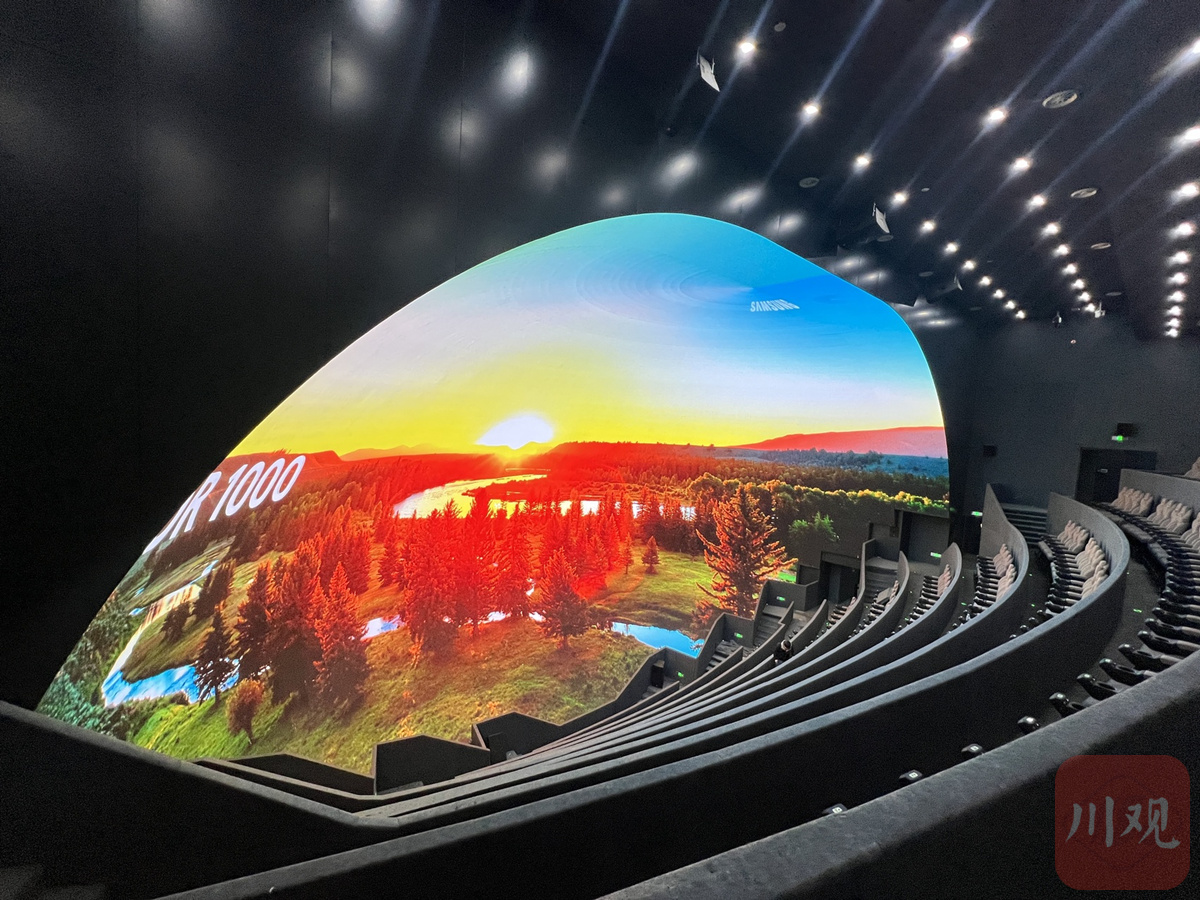“这是园区的重量级项目——飞翔影院,可容纳232个人观看。”庞丽环带着记者来到影院内,“这也是目前国内最大的16K超高清LED飞翔球幕影院,屏幕面积约740平方米,相当于1.74个标准篮球场。”