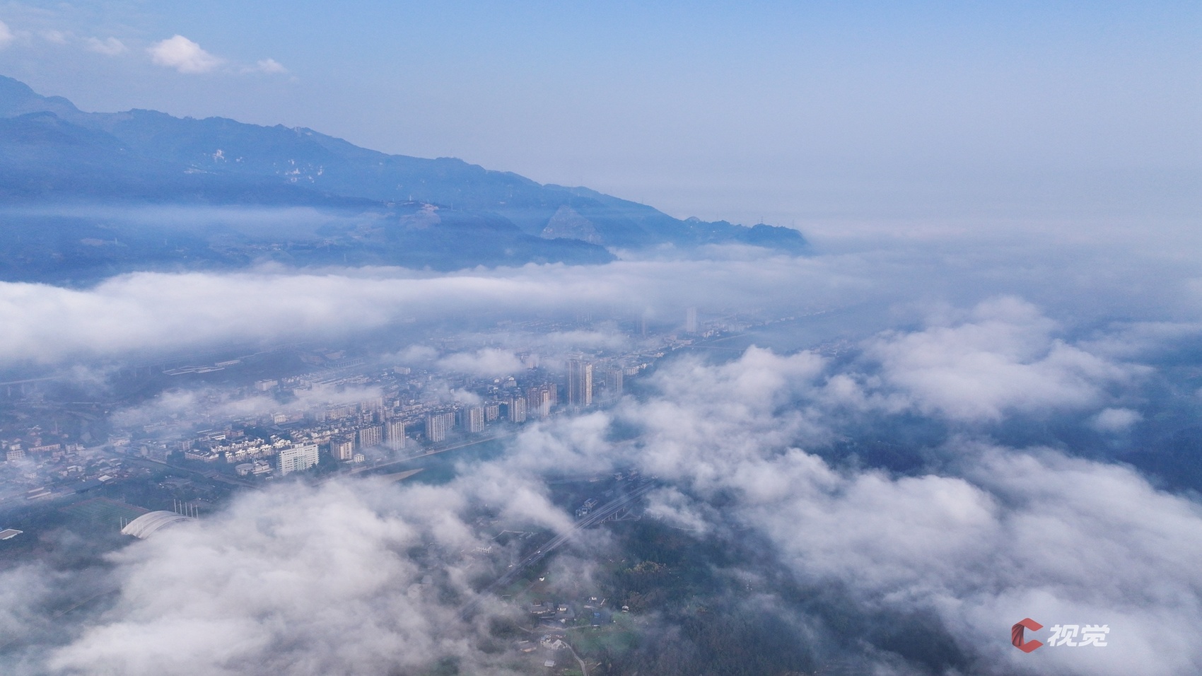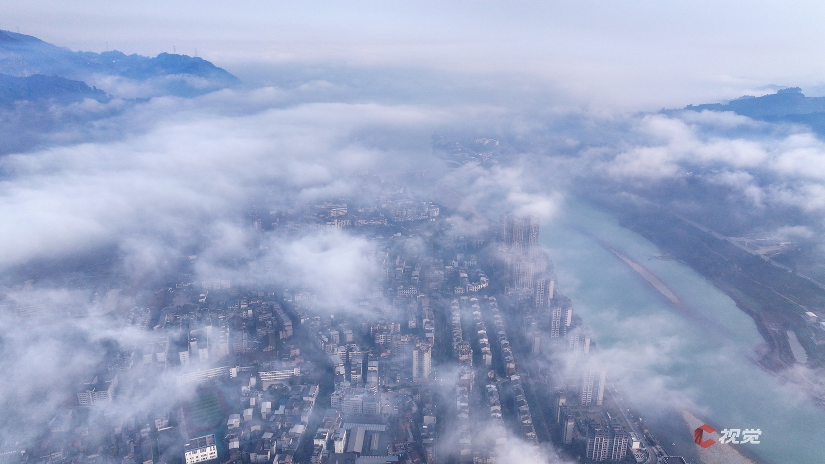 云雾缭绕的乐山沙湾城区美如画卷。