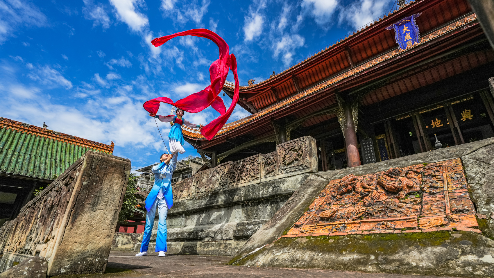 文庙大成殿前的木偶表演,展现古老资中的文化底蕴。(资料图)
