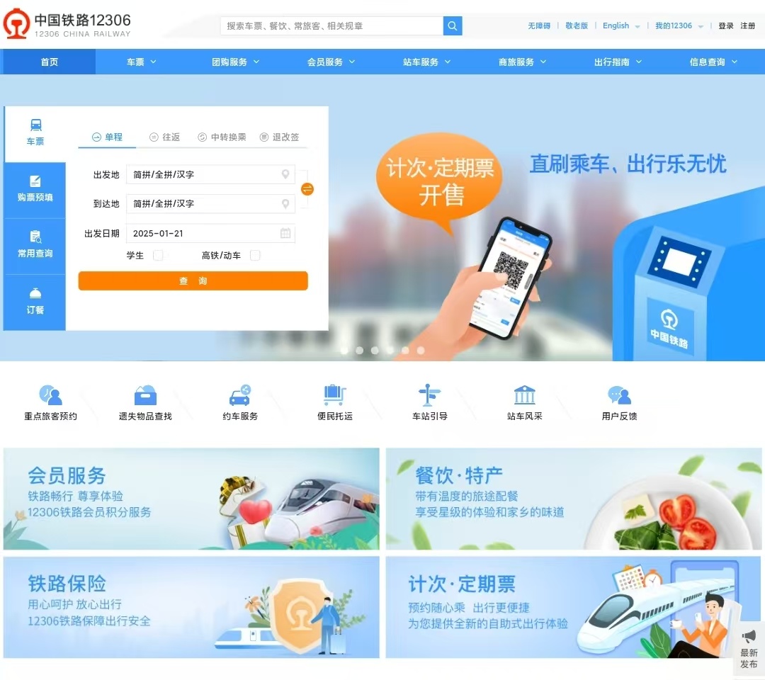 提供在线查询和预订全国火车票功能,重点旅游预约、遗失物品查找、车站引导等服务都可以在这里进行查询,归家之路,快人一步,助您安心出行。