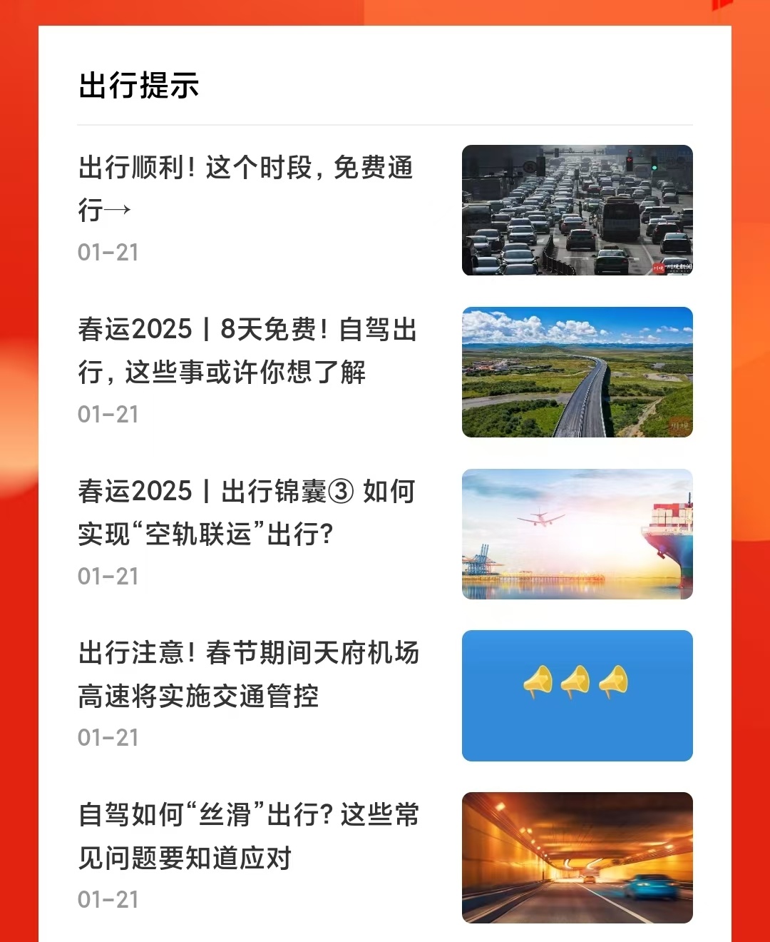 世界上最美的风景,大概就是回家的路。小年已至,归家有期,在外奔波忙碌了一年的你,是不是已经收拾好行囊,踏上回家的旅途了呢?四川春节服务平台与您同行,川观一路相伴,千山万水亦是坦途!