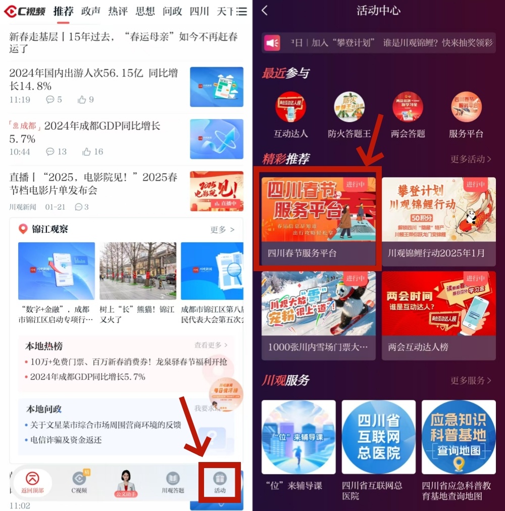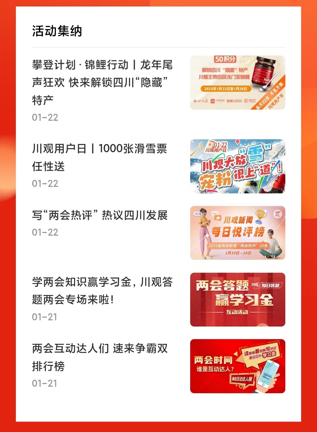 春节期间,川观新闻推出一系列精彩活动。当您踏上走亲访友的温馨旅程,或是穿梭于各地去打卡令人垂涎的美食、邂逅醉人的美景时,这些活动将为您的假期生活带来更多欢乐与惊喜,伴您欢乐过年。