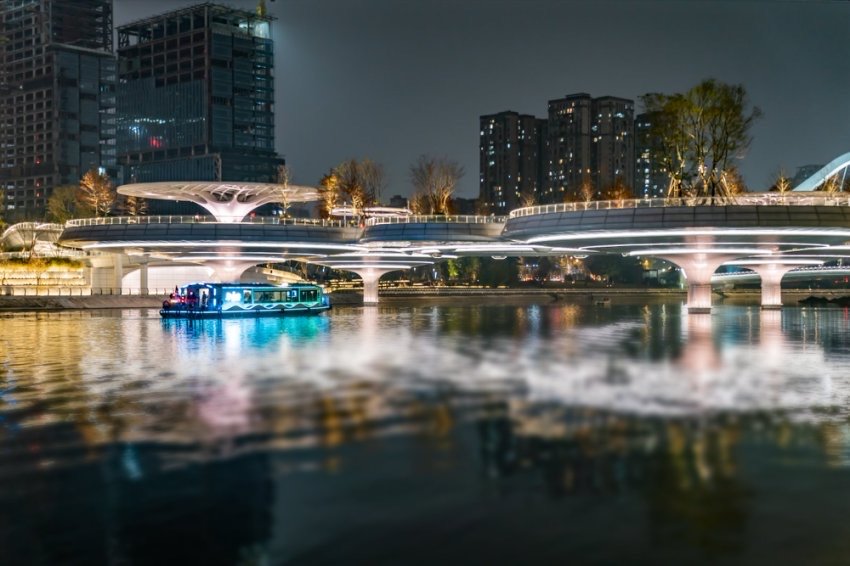 记者登上一艘游船,穿梭于光影交织的水面,除了能观赏两岸的环球中心、复地金融岛、天府双塔等建筑外,锦江上次第排开的数座桥梁也是亮点,宛如一条璀璨的珍珠项链,串联起蓉城的时尚风貌。比如被称作“莫比乌斯环”的网红五岔子大桥,科技感与未来感相互交织,象征无限的潜力与拥抱未来;去年开通的交子人行桥·莲桥,桥面由9个300—1600平方米的空间组成,酷似9片漂浮在水上的“莲叶”。白天时分,阳光穿过“莲叶”之间的结构空隙,在水上投下变化的光影,呈现如梦如幻的效果。