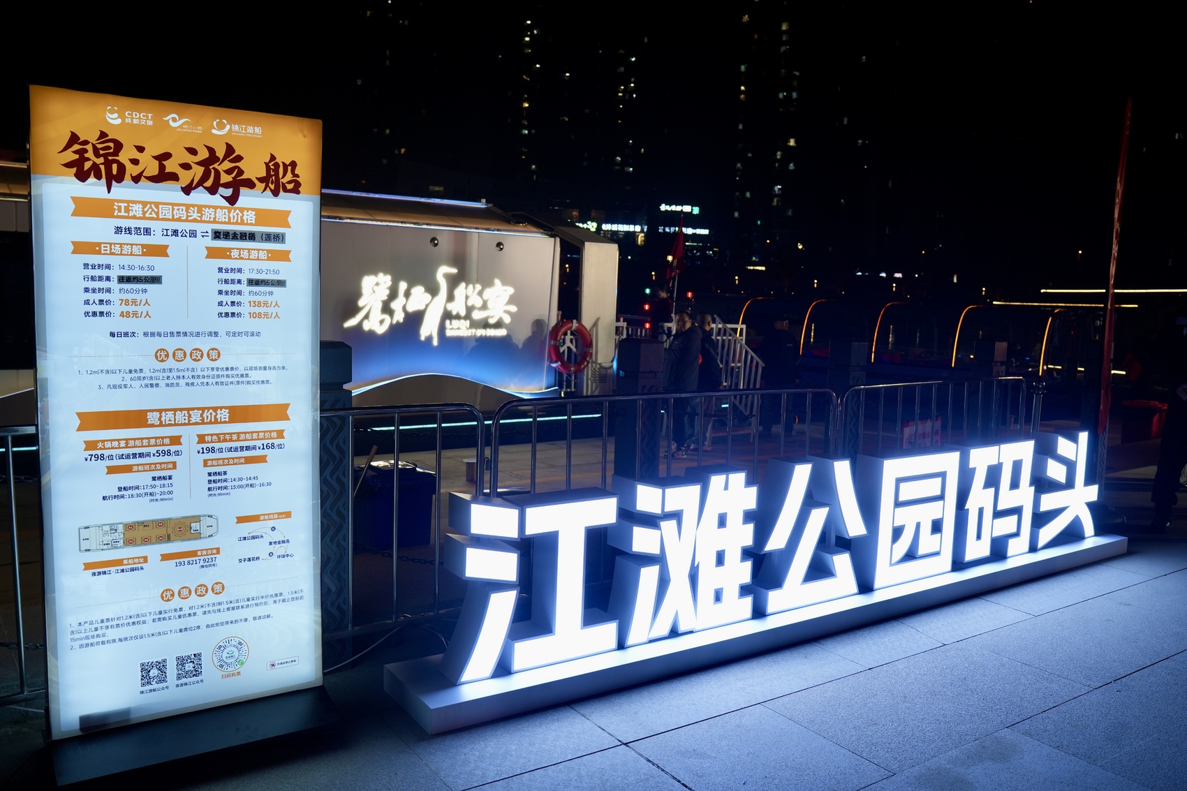 随着夜幕降临,几艘挂着彩灯的游船从江滩公园码头出发,沿锦江缓缓开行。