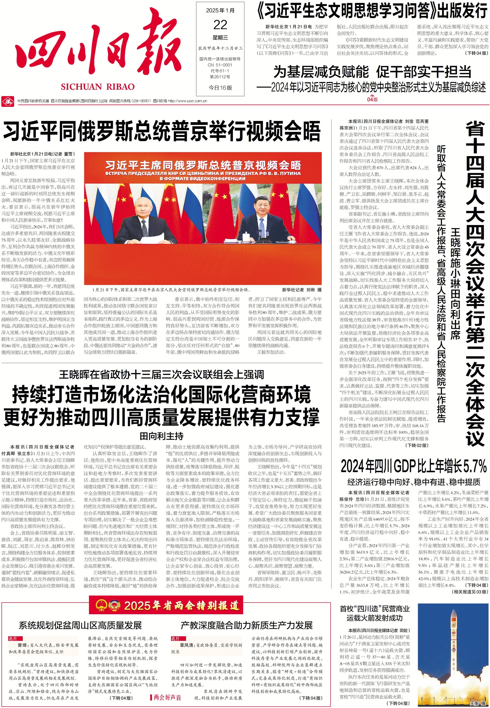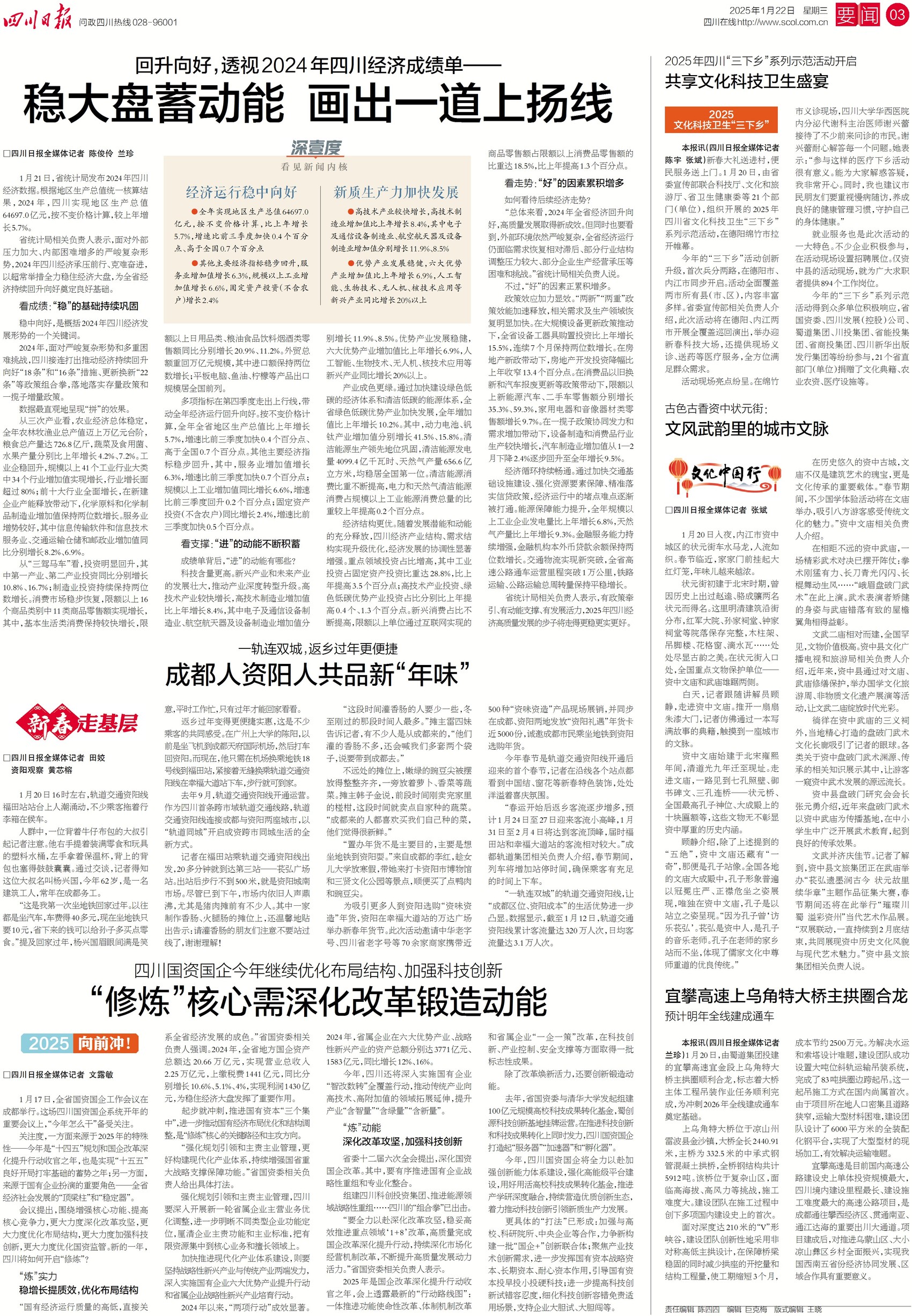 昨日,2024年四川经济数据发布。根据地区生产总值统一核算结果,2024年四川实现地区生产总值64697.0亿元,按不变价格计算,比上年增长5.7%,增速比前三季度加快0.4个百分点、高于全国0.7个百分点。关注今日一版、三版,看四川去年在面对外部压力加大、内部困难增多的严峻复杂形势下,如何以超常举措稳住经济大盘,为全省经济持续回升向好奠定良好基础。