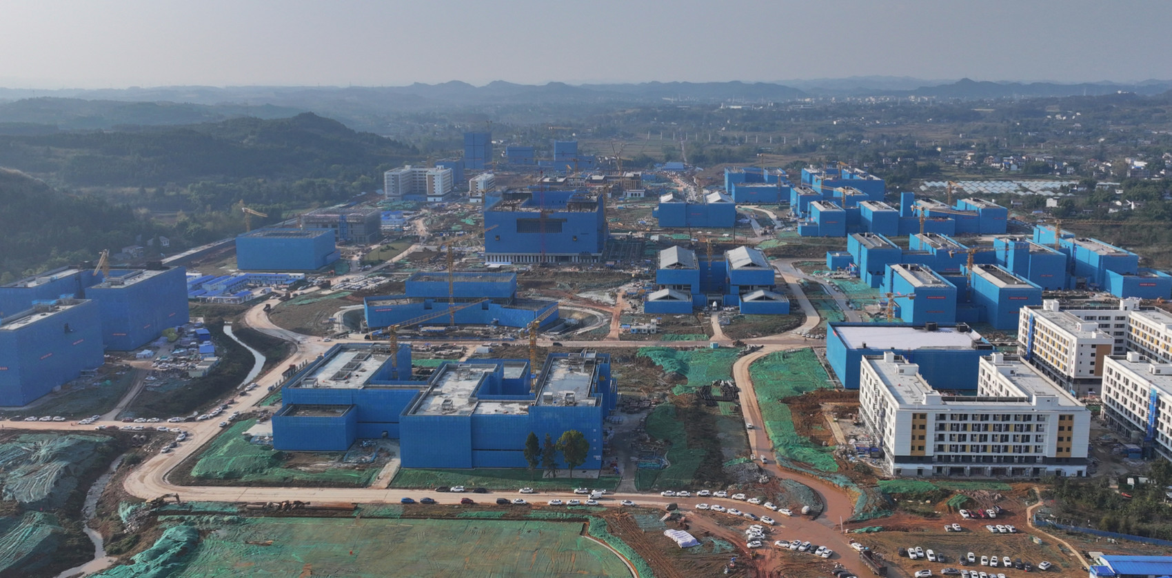 不远处,建设中的南充市医学科学产业园项目也进入冲刺阶段。项目已有30栋建筑封顶,累计完成施工53万平方米,建设进度已达88%。“有望在今年6月实现竣工,9月投入使用,设计可容纳2万余名学生。”该项目负责人石永龙介绍,作为2025年省、市重点项目,南充市医学科学产业园规划总用地1820亩,竣工投用后川北医学院将整体搬迁至此。