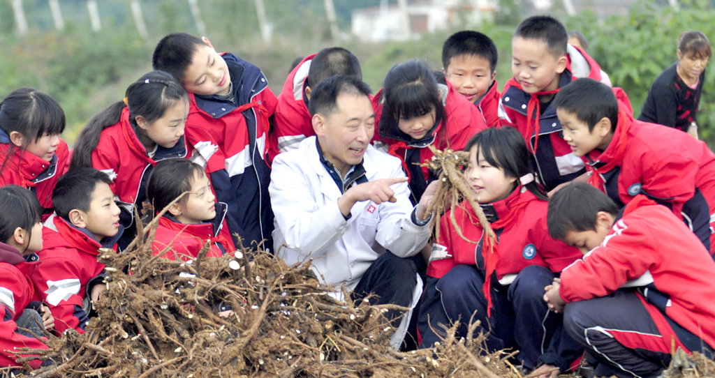 绵阳市梓潼县仙峰小学学生在医务人员指导下辨识芍药、了解芍药药性。 成和平 摄