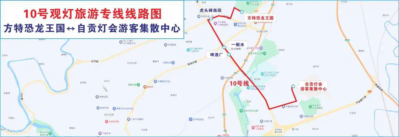 方特恐龙王国公交首末站—虎头碑路南段—一碗水—啤酒厂—自贡灯会游客集散中心
