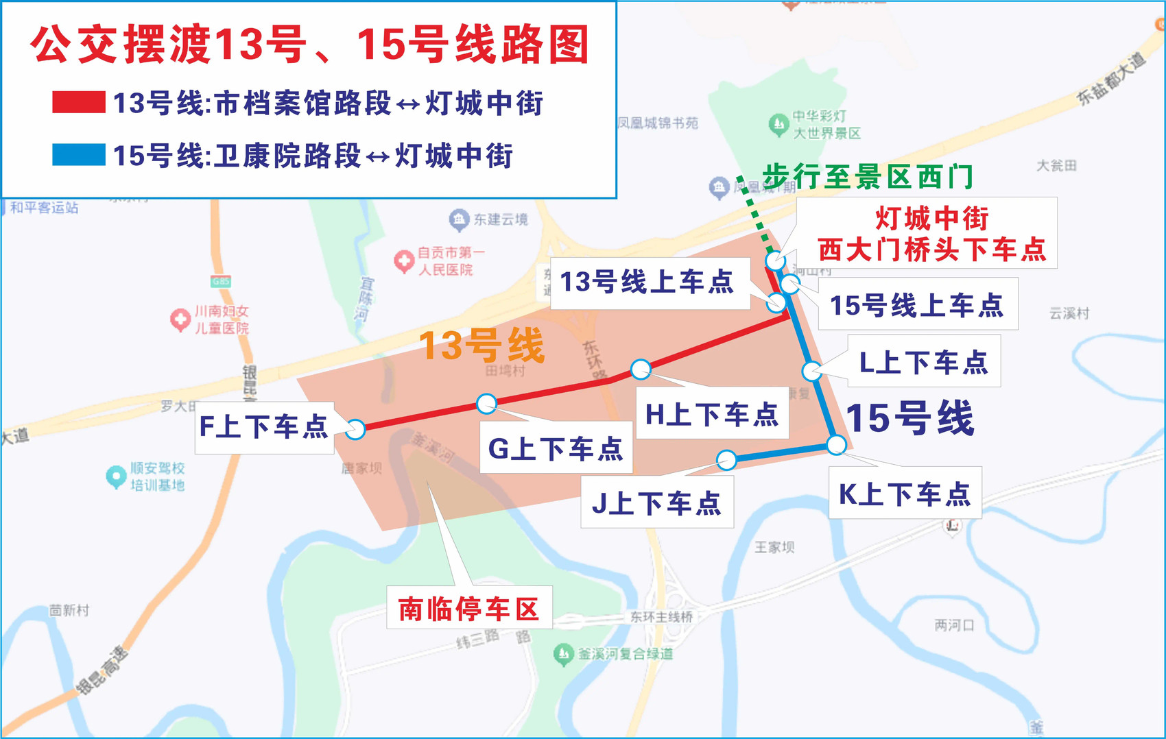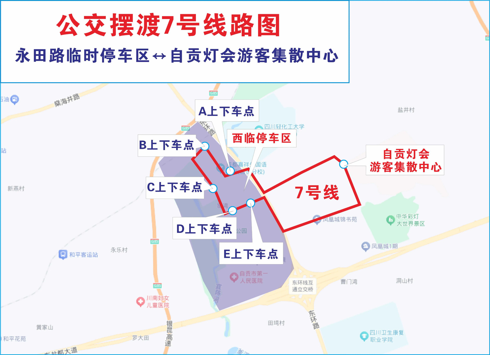 永田路临时停车区↔自贡灯会游客集散中心,沿线共设置5个上下车点位。