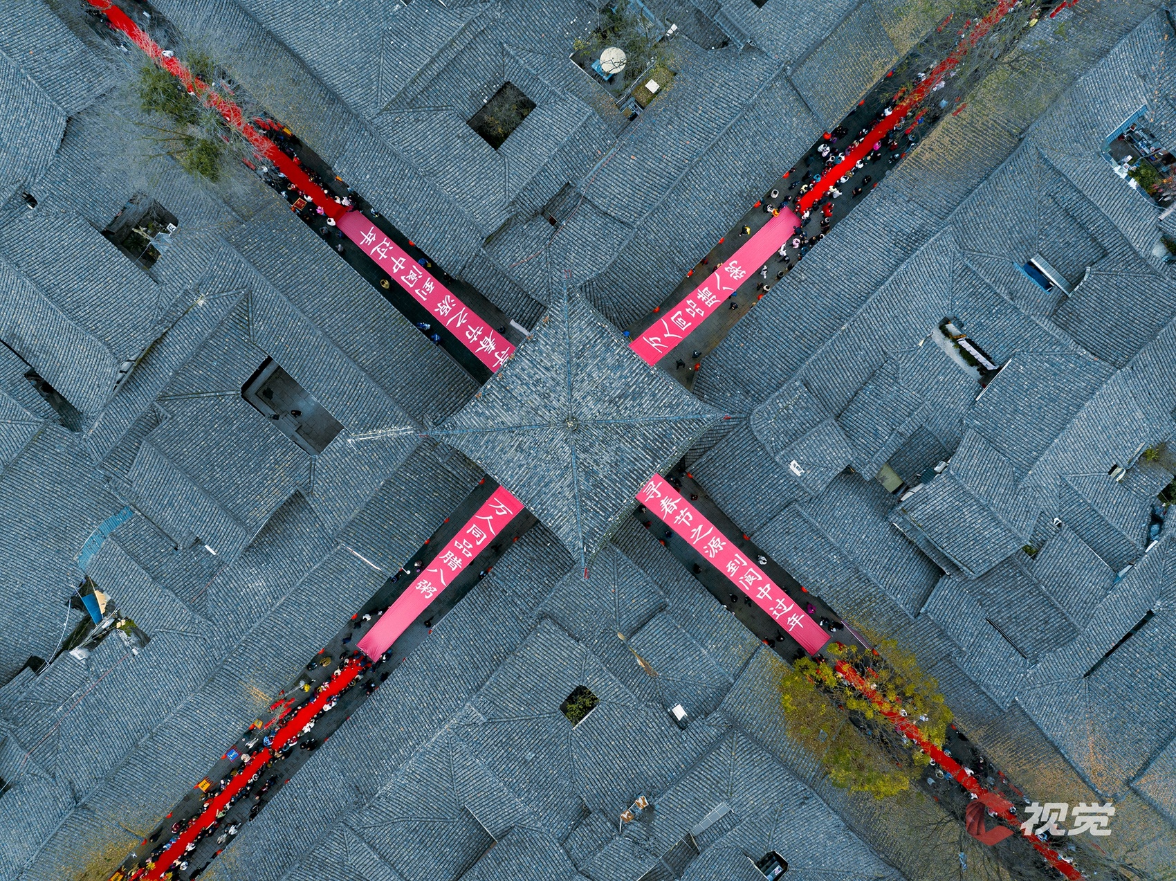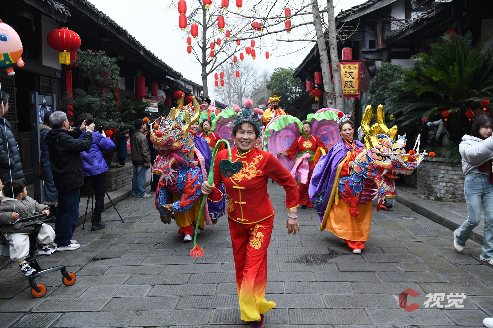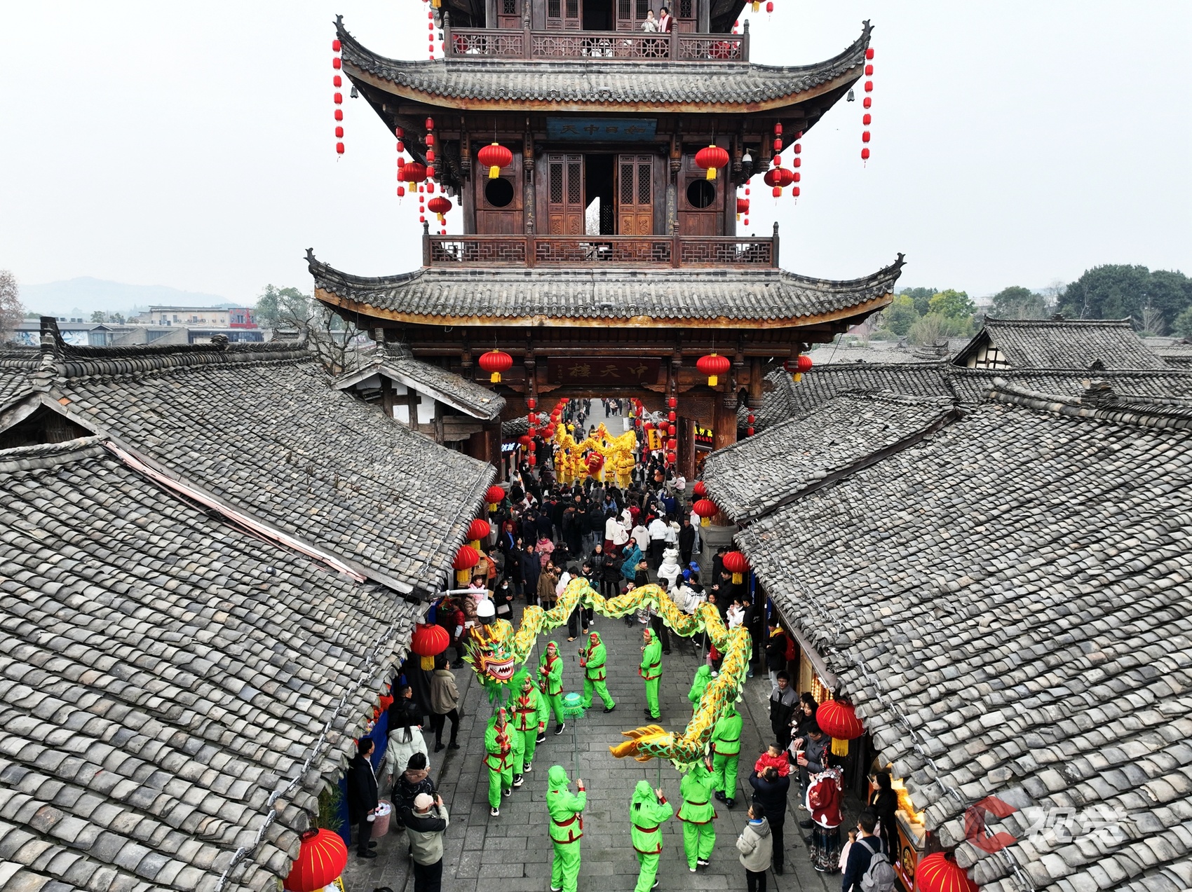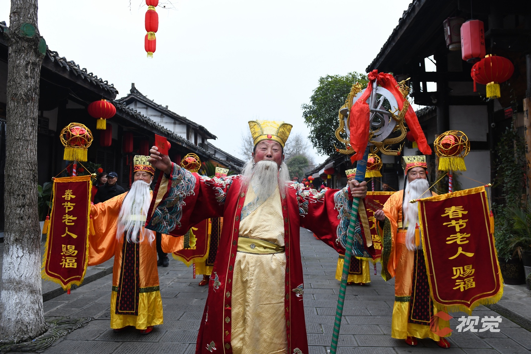 1月21日,阆中古城春节老人赐福、舞龙舞狮、打春牛、倮倮说春等民俗活动轮番上演,吸引众多游客和市民观赏互动。C视觉 梁德 摄