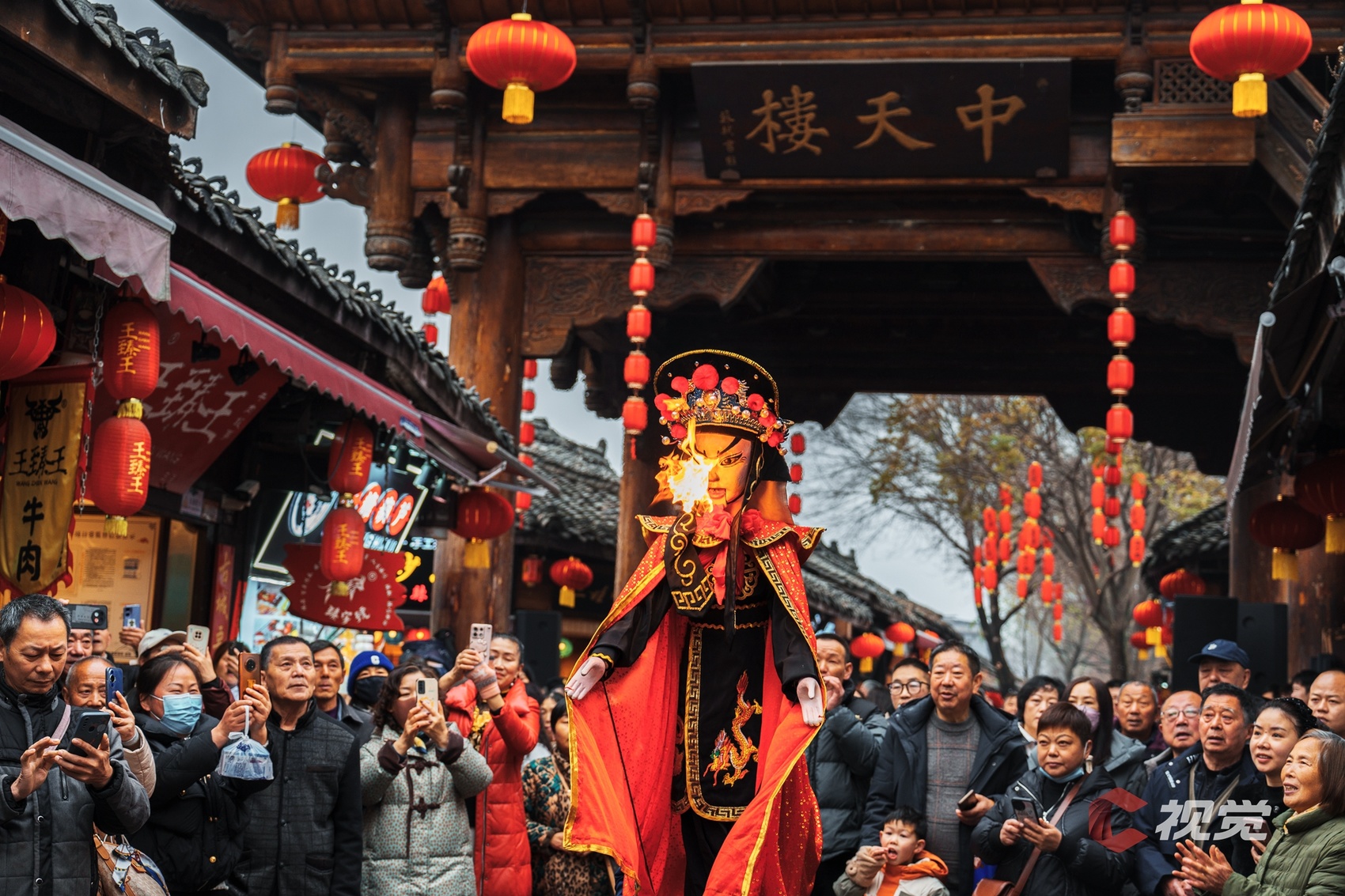 1月7日腊八节,阆中古城举行舞龙舞狮、赶年、春节老人赐福、川北大木偶喷火巡游等非遗活动。C视觉 李佳 摄
