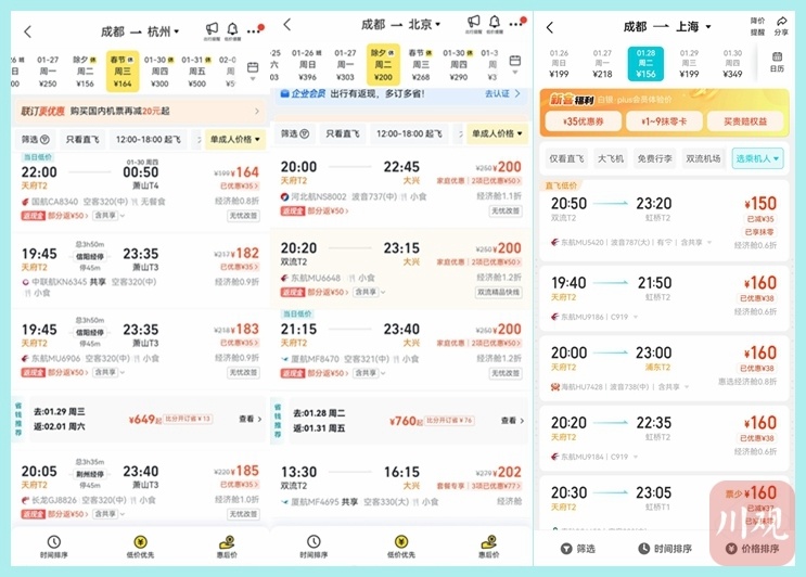 不过需要说明的是,成都飞往国内城市的低价机票多为凌晨左右抵达,多在除夕、春节等时间点;飞往曼谷、首尔等国际城市的低价机票,多为廉航、中转航班,或者没有托运行李额。