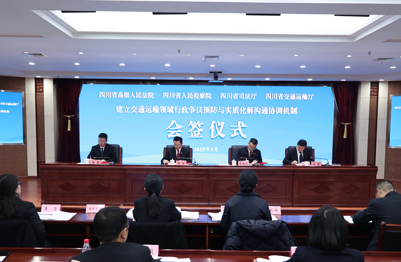 1月21日,四川省交通运输领域行政管理、行政复议、行政审判、行政检察院厅联席会议首次召开,省法院、省检察院、司法厅、交通运输厅共同建立交通运输领域行政争议预防与实质化解沟通协调机制,院厅联手,有效预防和化解行政争议。