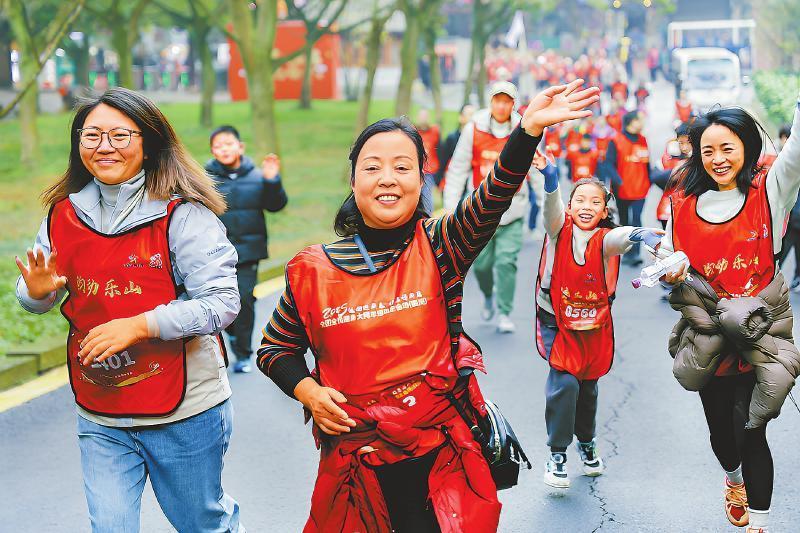 9时50分,随着一声枪响,2000余名健身爱好者从乐山大佛牌坊出发,一路攀登至集凤楼,经过麻浩渔村,最终抵达乐山大佛南游客中心,以运动健身、登高望远的方式开启健康活力新一年。沿途不时有川剧艺人在表演变脸吐火、特色玩偶,运动和文化交相辉映。