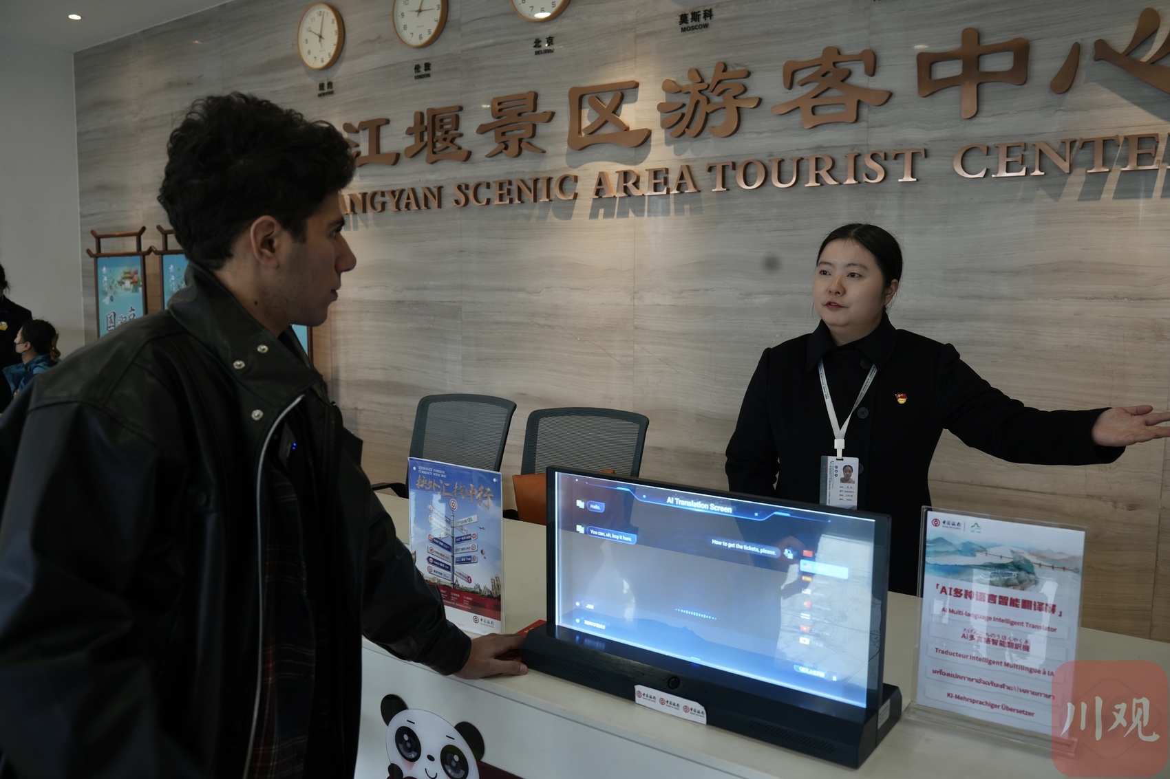 都江堰景区游客中心前台,一位外国小伙子操着英语“连说带比划”,工作人员李奕和他简单交流得知,对方只会英语和阿拉伯语。