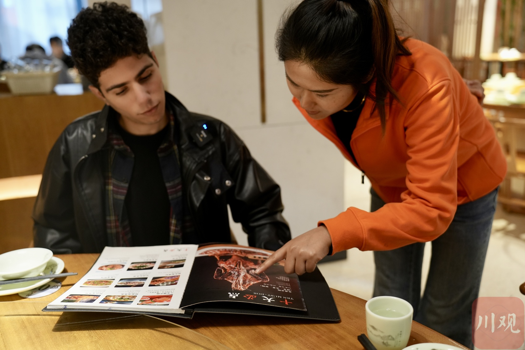 川观新闻记者注意到,钟鸭子川菜馆厚厚的一本菜单上,每个菜品都有中英双语介绍,瓦赫比可以自己在菜单上点菜。
