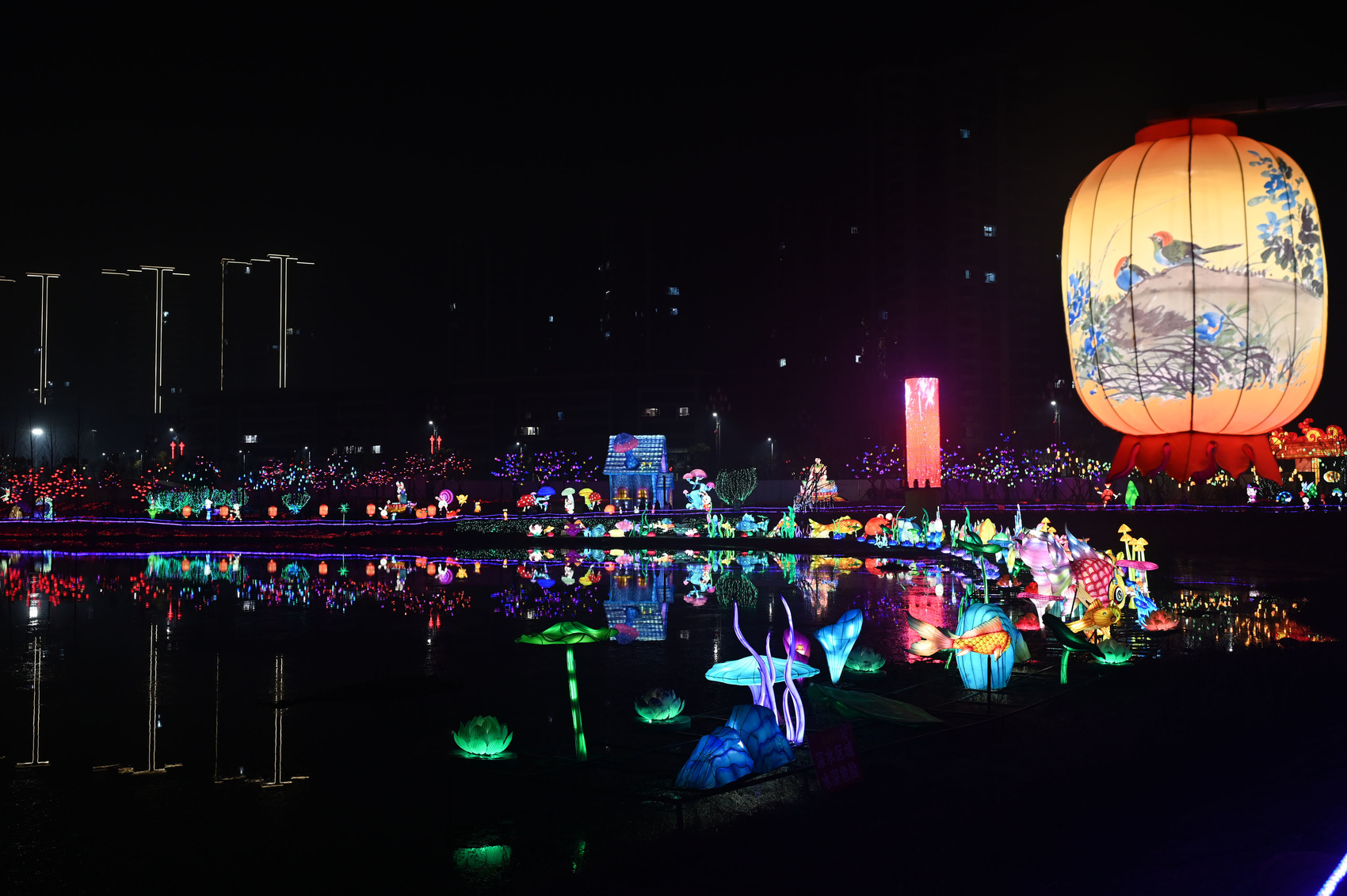 1月22日晚,内江市东兴区汉安湖新春灯会亮灯,60余组特色灯组吸引众多游客前来赏灯游玩。