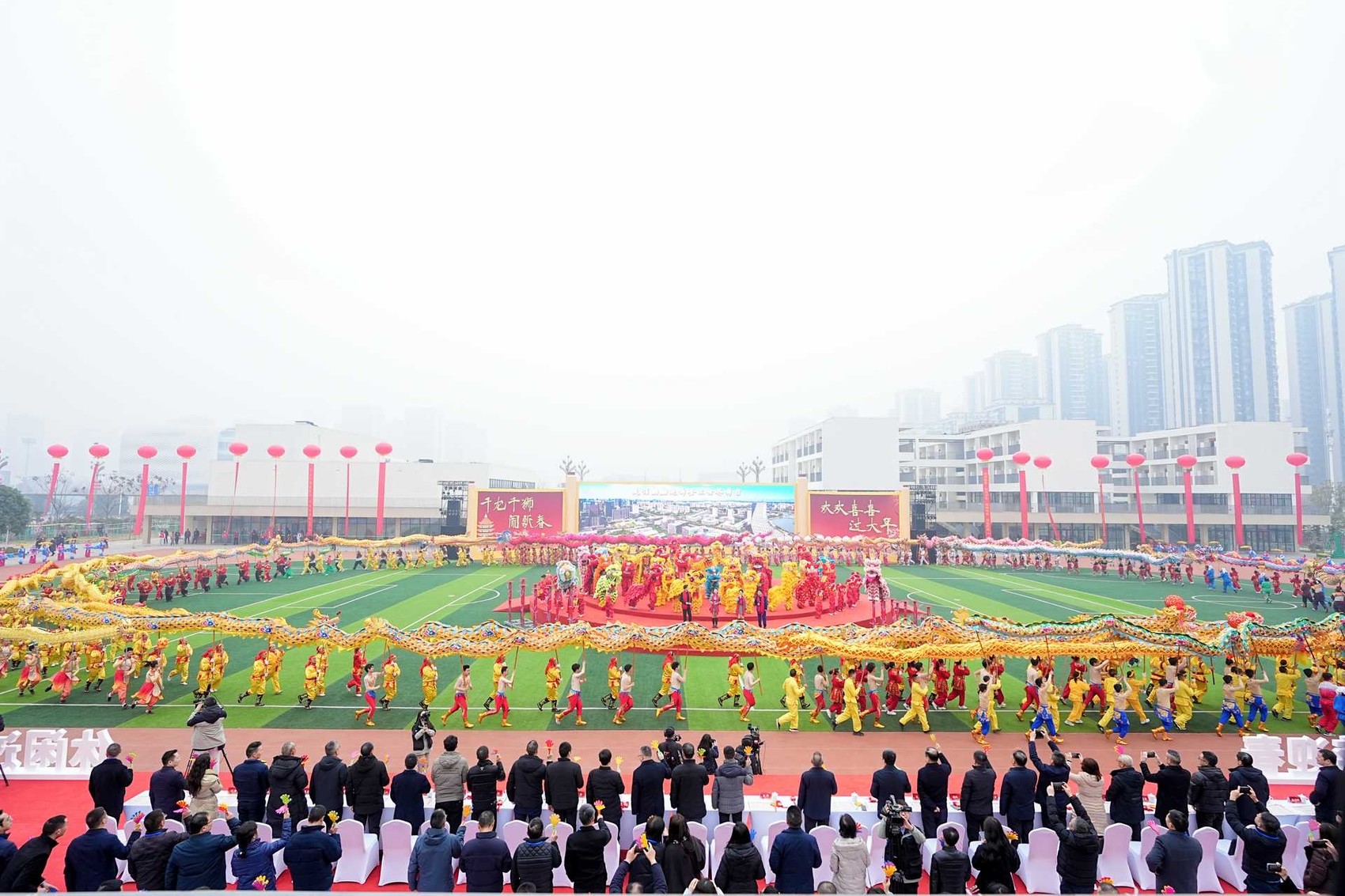 除了龙狮特色展演外,现场还进行龙狮集中展演。集中展演共分为三个篇章《旌龙献瑞 德润万家》《蜀狮昂首 文旅繁花》《龙腾狮跃 盛世中华》。整个团体式展演与民俗展演相结合,表达“龙狮闹新春 巴蜀过大年”主题寓意。