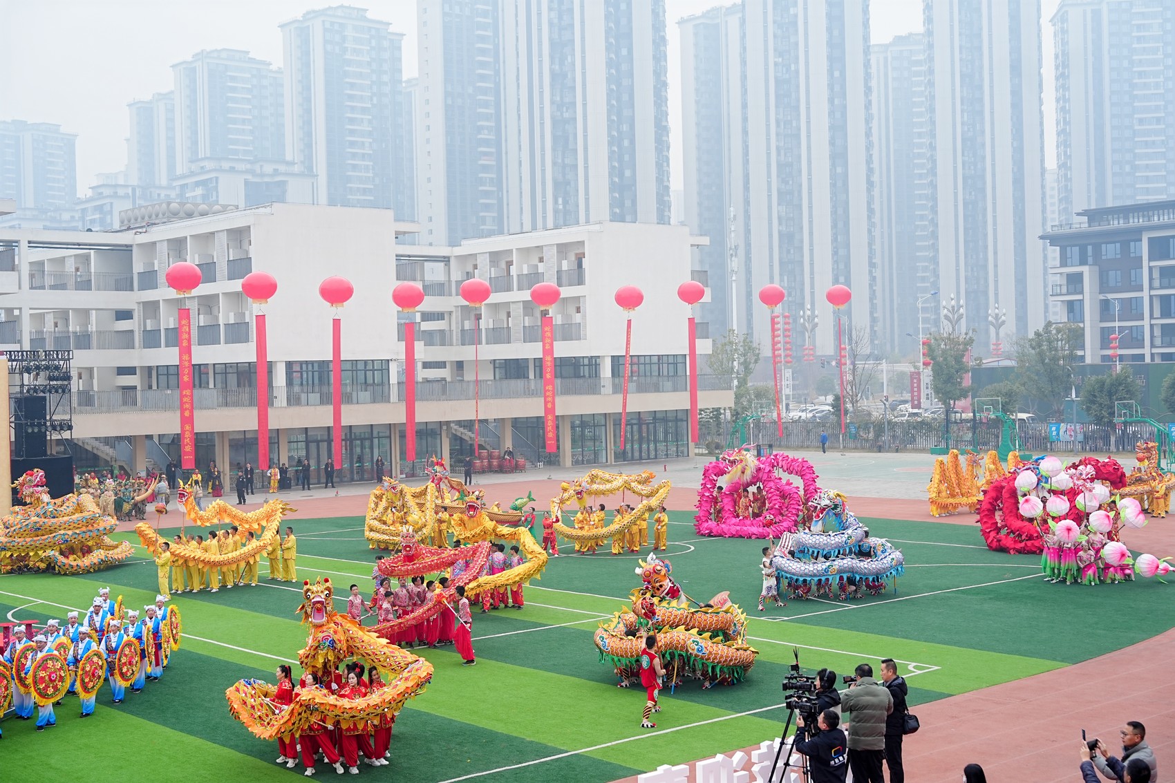 “咚咚锵、咚咚锵……”鼓乐声中,各代表队的舞龙表演精彩纷呈,只见一条条祥“龙”腾空而起,游、腾、跃、翻、滚等动作行云流水,气势磅礴,或上下翻飞,或蜿蜒盘旋,当龙头一横,龙须一甩、龙尾一摆,翻腾的长龙引得在场观众阵阵喝彩。