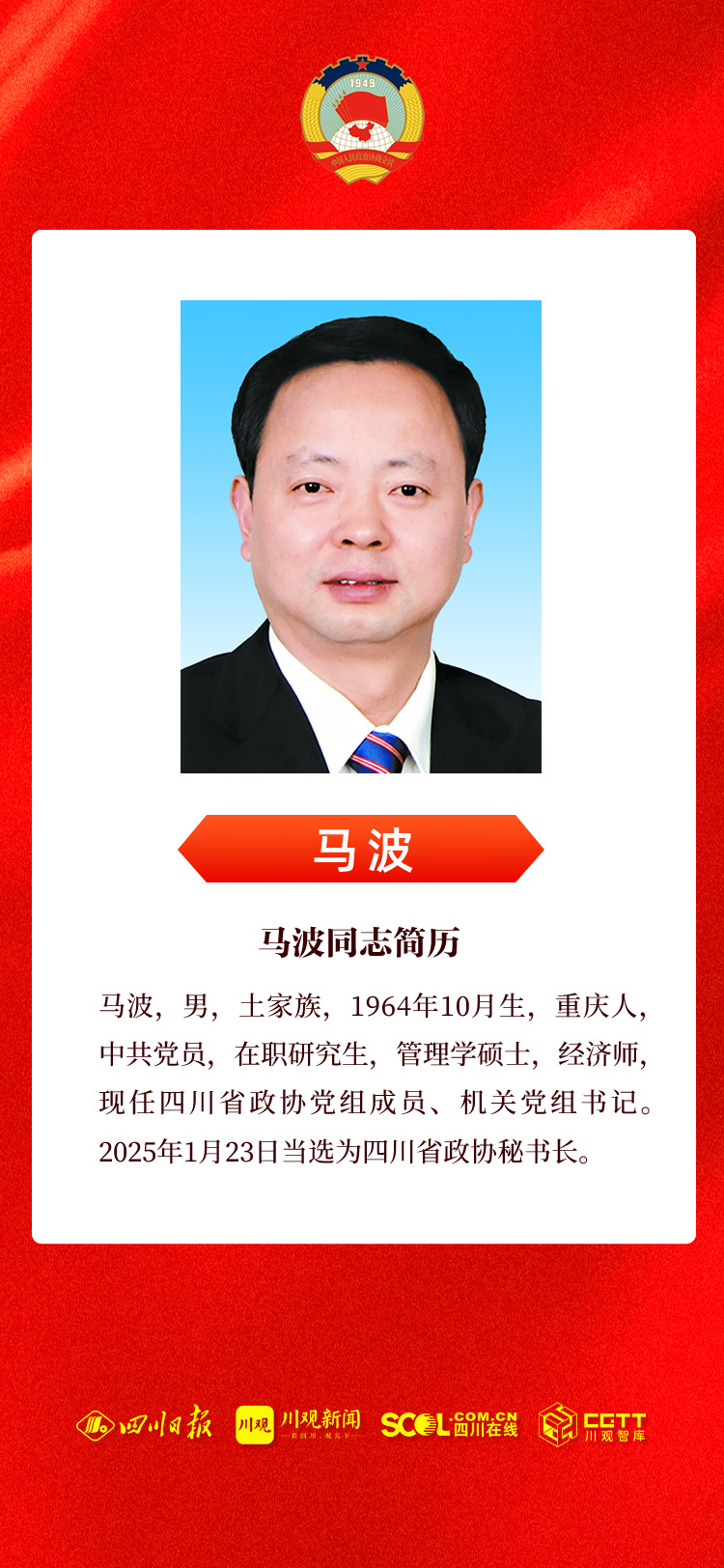 1月23日,政协四川省第十三届委员会第三次会议举行第三次全体会议。马波(土家族)当选为政协四川省第十三届委员会秘书长。