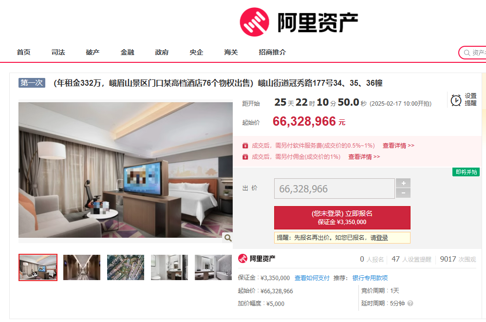 峨眉山脚下的一知名品牌酒店部分产权,将于2月17日被拍卖。记者了解到,截至1月23日16时,已有9148次围观,但暂无人报名。