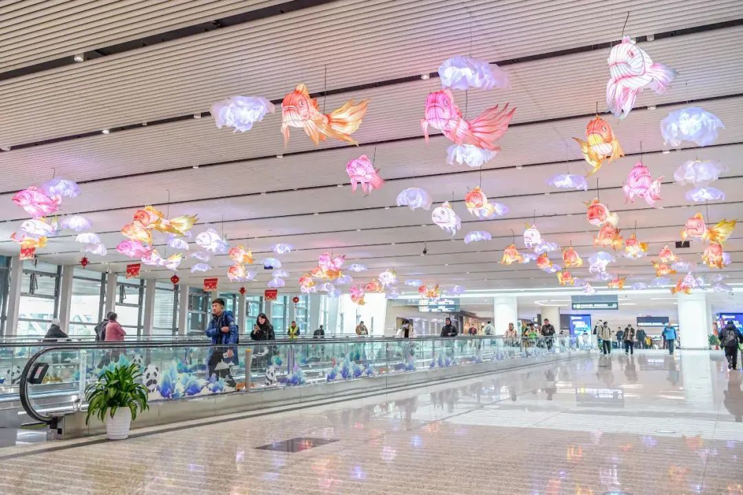 位于1号航站楼出发大厅的“旅行熊猫”灯组,使用传统彩灯工艺,呈现出时尚的现代气息,体现当代都市生活的多元与活力,激励年轻人勇敢追逐梦想;在交通中线(GTC),抬头有“福泽锦鲤”灯组,流畅动线展现出优雅姿态,地面上则有“川剧熊猫”“大美四川”等灯组,整合川剧神韵与熊猫萌态,蜀绣与光影艺术,展现非遗文化的独特魅力和四川自然人文特色。