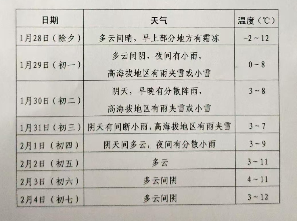 1月24日上午,四川省气象台发布了春节专题天气预报。预计1月28日至2月4日春节假期,全省无强冷空气影响,气温波动幅度不大,以晴阴相间天气为主,有一次弱降温降水天气过程。