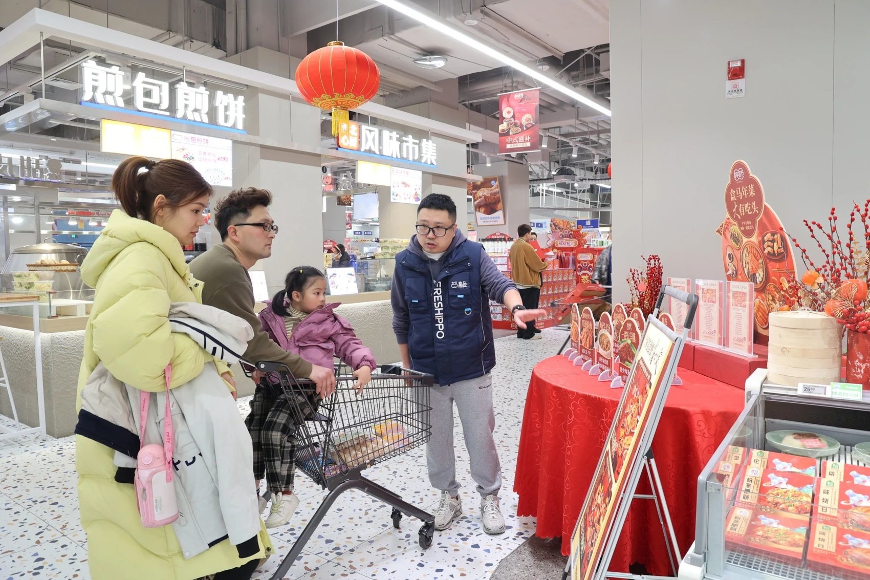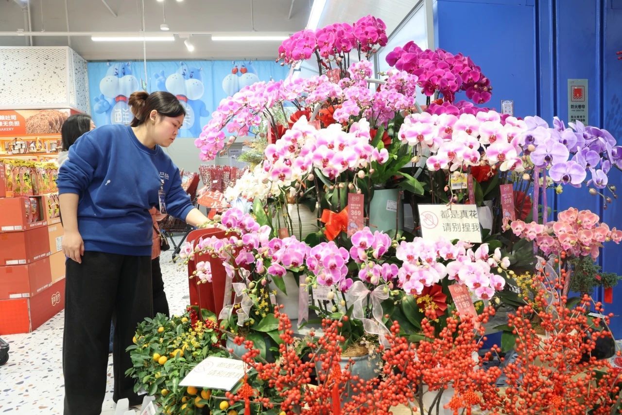 双店齐开的“盒马鲜生”,是龙泉驿区居民新春购年货的热门地。在“盒马鲜生”吾悦店入口,年宵花、蝴蝶兰、进口朱顶红等鲜花饰品,让年味迎面而来;超市内,选购生鲜果蔬、米面粮油、烘焙零食的消费者络绎不绝。“能送上门的年菜”吸引了洪先生等诸多消费者关注,他表示,“第一次见这样的年夜饭套餐,感觉很方便”。