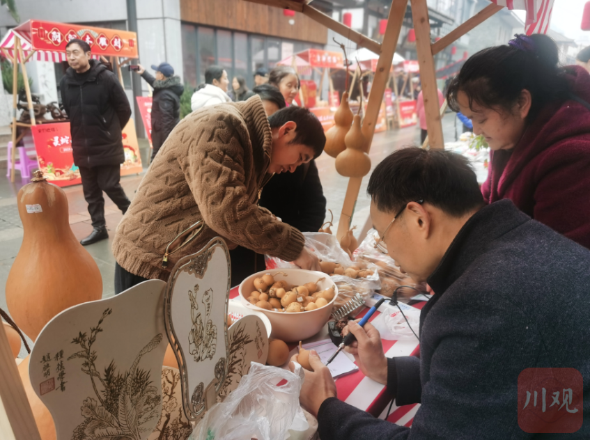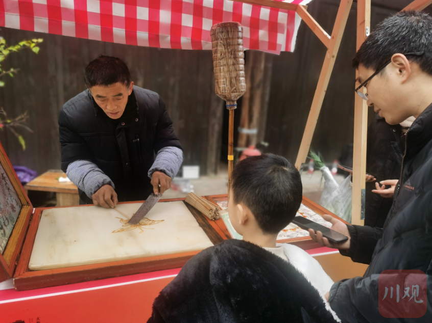 活动现场,舞龙舞狮、笑和尚送福、川剧变脸、秧歌彩带舞等民俗文艺表演轮番上演,为观众带来一场震撼的视觉盛宴。另一边,非遗集市里展示了眉州面塑、东坡剪纸、青神竹编、火绘葫芦等10余种精湛技艺,匠人们现场演示,让大家在观赏中领略非遗文化的多样性和丰富性,共同感受老镇文化味浓、烟火气足的独特氛围。