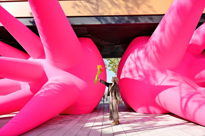 同时,位于金牛区的天府艺术公园正在举行“蓉荣——首届天府艺术季”,特别邀请国际知名艺术家史蒂夫·梅萨姆委任创作装置艺术作品,以大型充气结构为主体,在桥面与地面之间延展,其独具视觉冲击力的放射性形态与富有张力的鲜艳色彩,呼应着芙蓉花繁盛灿烂的绽放姿态,以此展现成都这座城市的文化活力与不断生长的生命力。作品一亮相,就成为市民游客新的打卡点。