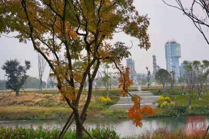 站在公园里的绿道远望,曾经青白江的两大“擎天柱”——川化集团和攀钢成都公司的厂房依然伫立在南岸,一栋栋商品房正在北岸拔地而起,形成鲜明对比。
