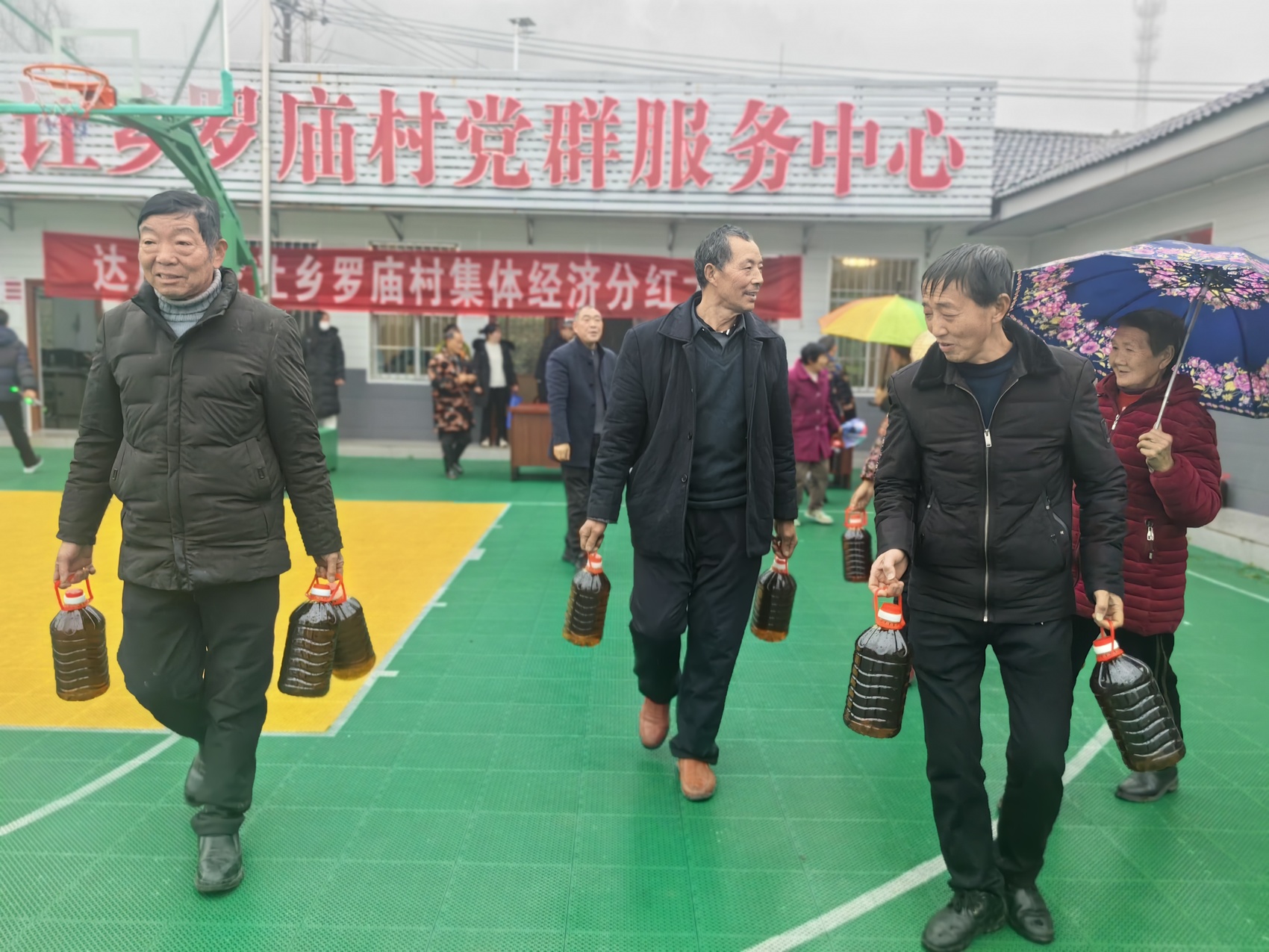 这天,罗庙村举行村集体经济分红大会,拿出800斤菜籽油,这是村里榨油坊自榨的,折合价值1万元,5斤一桶装共享给村民。这是罗庙村有史以来首次村集体经济分红。