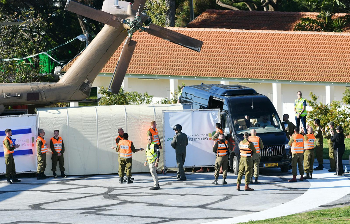 1月25日,搭载获释以色列被扣押人员的直升机抵达以色列佩塔提克瓦的一所医院。新华社/基尼图片社