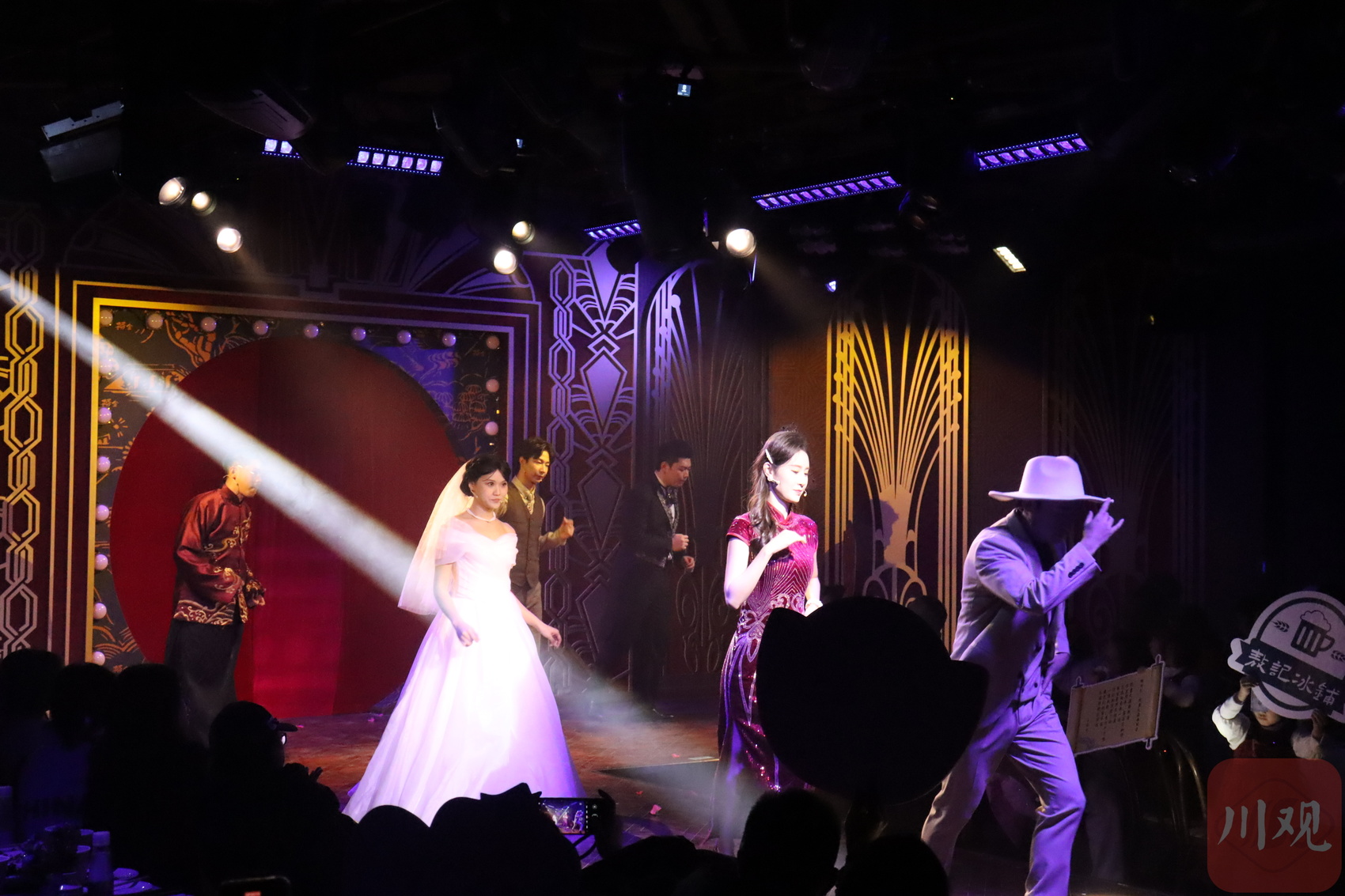 演出现场融合了传统话剧、魔术、歌舞等多种形式。随着晚宴的进行,多道特色餐饮陆续上桌,观众在笑点密集的演出中边吃边喝边玩,不时被邀请至台上共演,沉浸感十足。