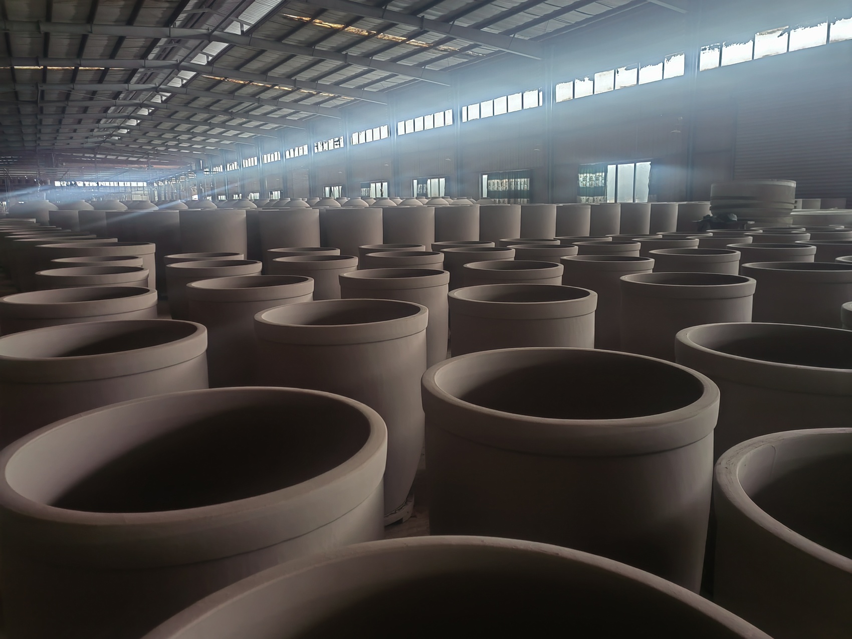 上尖、中鼓、下圆,高1.8米左右,看起来像一粒超大号的米粒竖立在那里。如此特异的造型在明峰陶业连绵的成品广场上非常的醒目。蒋秀萍告诉记者,这就是法国波尔多地区客户的定制产品,用于葡萄酒的贮存。“工艺和材料要求高,但是订单规模不大,无法批量化生产,还只是小规模业务阶段。”