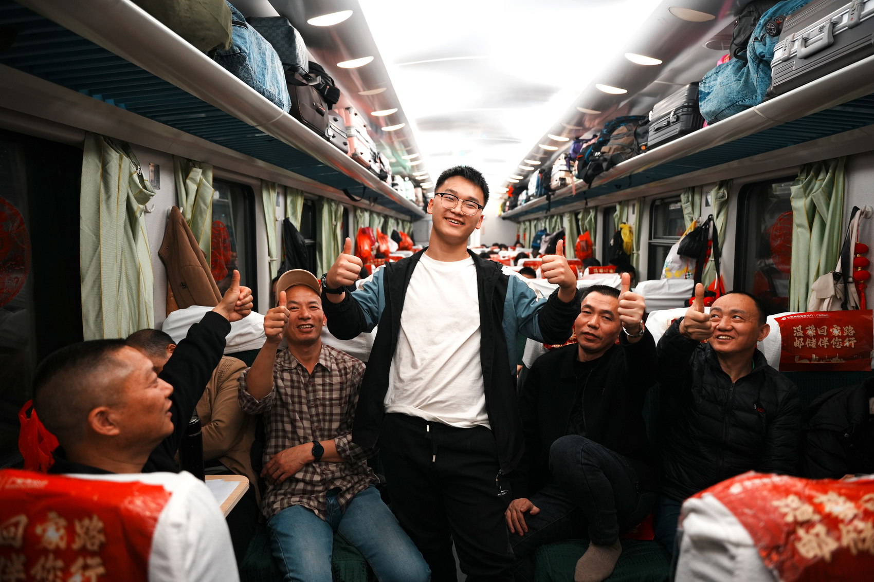 返乡专列车厢内的乘客